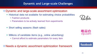 Ruelala和唯品会是快消品的销售平台,销售时间很短,没有足够多的历史数据去学习用户对产品的喜好程度。Facebook在做在线广告的时候,若产品的选择数以百万计,这时候就无法估计用户对每一个产品的喜好程度。所以我们需要动态推荐系统,把机器学习和智能决策结合起来。