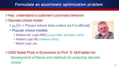 做Assortment optimization?首先,我们要了解客户的购买行为,然后用choice model(选择模型)去做选择。