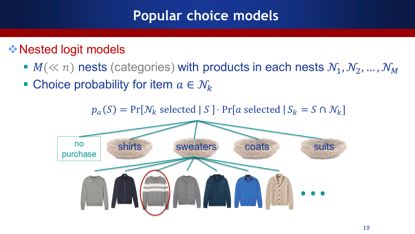 Nested logit models是先选择一个大类,然后在大类中再进行产品的选择,如上图所示,概率分成两部分,一部分是选择毛衣的概率,另一部分是选择毛衣的具体款式的概率,这样就构建了一个多层的选择过程。