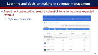 这个研究工作叫Assortment optimization,基本上是一个推荐系统,比如搜索一个航班,它会自动帮我挑出性价比最高的几个航班。