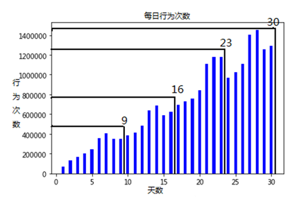 图(二) 第二个原则,我们是根据图二得出的规律,也就是窗口还需要满足数据分布的周期性,可以看出,每个窗口每天的行为次数都是周期性的增长,除了1-2这个窗口之外。因此1-2这个窗口就被去掉了,并且1-2这个数据窗口太小,信息量太小,显然也就舍去了。 表(一)