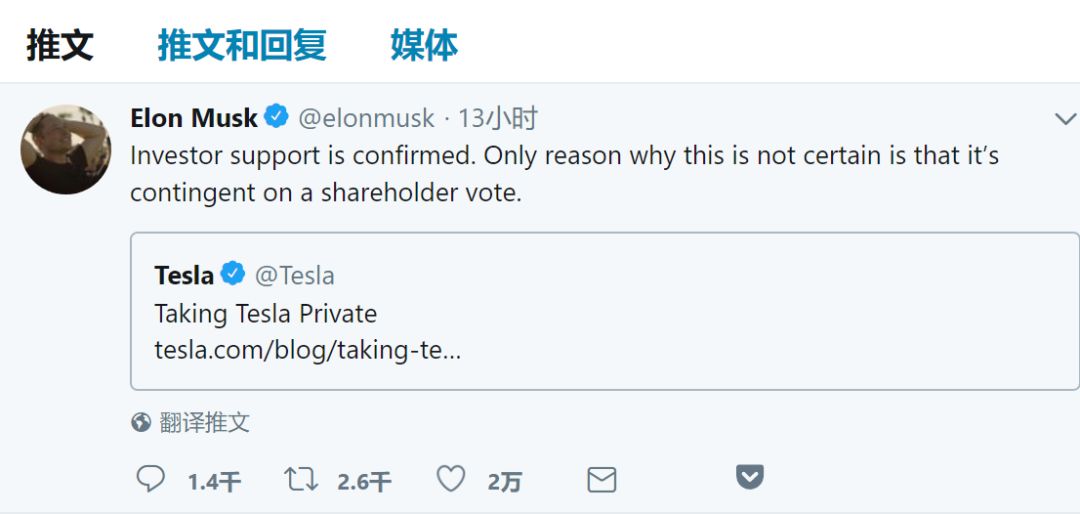 目前,美国证券交易委员会(SEC)对于私有化退市的规定相对简单,但有两个绝对条件: 一是由 1 位控股股东发起;二是收购流通股需全部以现金进行。由于从二级市场购入,比照市场价需有一定的溢价(高过市场价格即可)。 而马斯克已经在 Twitter 上表示,已经确认了私有化特斯拉的资金来源。