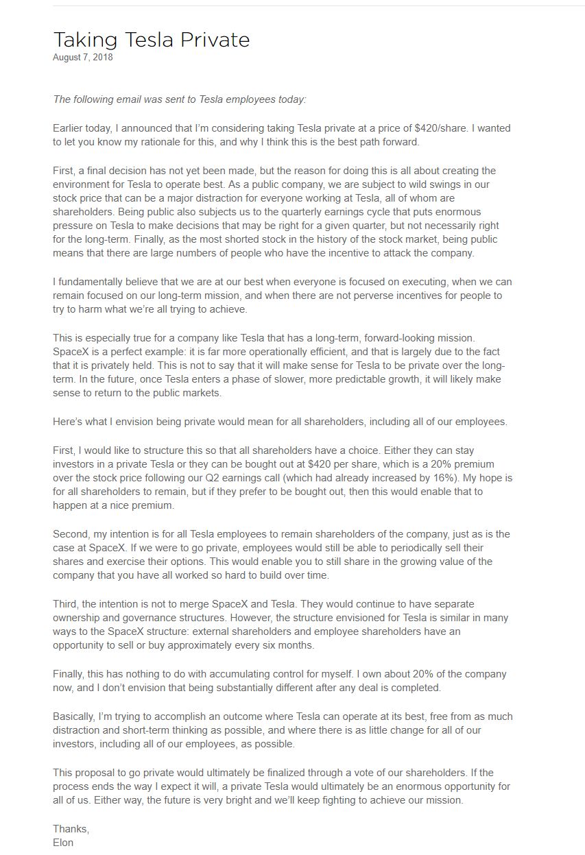 | 「我真希望特斯拉是一家非上市公司」,特斯拉 CEO 马斯克在去年 11 月接受《滚石》杂志专访时曾发出这样的抱怨,「成为上市公司之后,真的降低了我们的效率。」 2010 年 6 月 29 日,特斯拉上市。这也是自 1956 年褔特以来,第一家上市的美国汽车公司。 当时,马斯克曾希望人们能对特斯拉未来更乐观一点。 八年过去了,特斯拉市值已经超过福特、通用汽车等传统汽车厂商。但是,马斯克却需要持续不断地去应付那些质疑者,尤其是那些怀疑他的公司永远不会盈利的人。 今天的这一系列举动,证明他不想再为此纠结。 北京时间 8 月 8 日,马斯克发表公开信表示,希望以每股 420 美元的价格将公司私有化。此举如果成真,将使特斯拉的估值超过 700 亿美元,成为美国历史上最大规模的私有化交易。