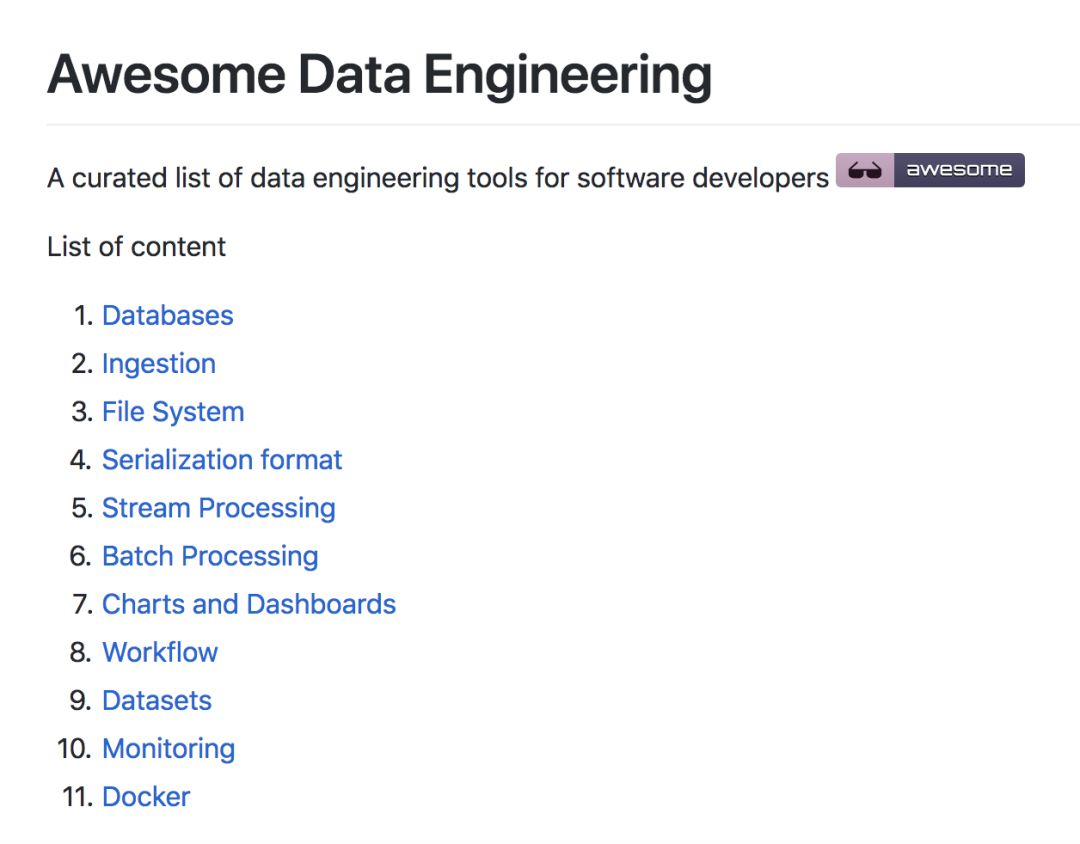 | 今天,文摘菌要给大家介绍一个数据工程(注:非数据分析)资源超级大列表,你想找的全部在这儿~(Github链接见文末) 这个资料集是由区块链公司POA Network的技术负责人Igor Barinov所制作的。资源本身并没有代码之类的内容,而是为大家总结了数据工程上必要工具的链接,包含了从数据库到并行处理,再到数据集等一系列内容。每一项分类下都有清楚的链接和简介。 这个资源集的目录如下: