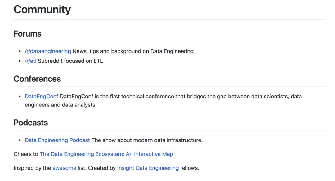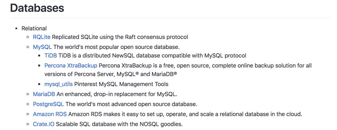 可以看到,仅仅是关系数据库这一项,作者就总结出了一份很齐全的工具列表,包括了MySQL、PostgreSQL等大家熟悉的工具,也有其它稍微陌生一点的名字。而MySQL下面也附着了基于MySQL协议的相关工具。 在整个数据库(Databases)的大板块下,其他的数据库模型(Key-Value、Column、Document、Graph、Distributed、Timeseries、Others)也被如此详细地总结出来。其他的大板块亦是如此。 此外,列表的最后还有一个社区的板块,包含了论坛、会议和Podcast的链接: