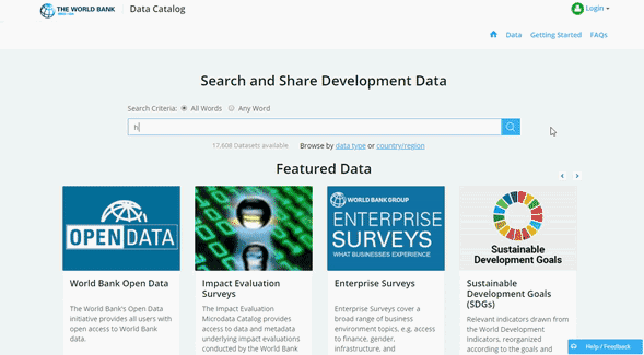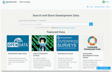 数据目录看起来对新手比较友好。你可以从一个地方搜索世界银行的调查、时间序列和跨所有区域和主题的地理空间数据。也你在数据集内搜索,甚至可以搜到指标和变量的名称。