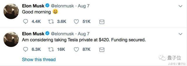 他在8月8日发出特斯拉计划私有化的消息,说要以每股420美元的价格"买回"特斯拉,而且资金已有保障,号召股东和员工给于支持。