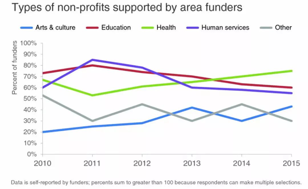数据是由投资者提供的,百分比之和大于100是因为调查者可以作出多个选择 改进之后的版本则是使用了潜意识属性。下面的图表中使用加粗的蓝色折线突出了最大的增长趋势,而其它所有的趋势则是采用了灰色,使其和背景融为一体。经由更好的视觉层次的结构,读者可以更加轻松的理解这张数据可视化图表。