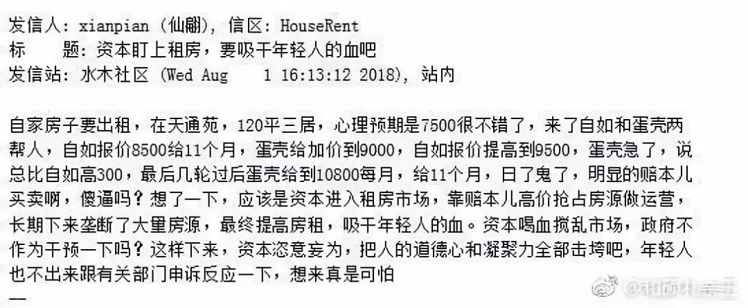 | 昨天还幻想海边别墅的年轻人,今天可能开始对房租绝望了。 8月初,有网友在"水木论坛"发帖控诉长租公寓加价抢房引起关注。据说,一名业主打算出租自己位于天通苑的三居室,预期租金7500元/月,结果被二方中介互相抬价,硬生生抬到了10800。 过去一个月,全国热点城市的房租如脱缰野马。一线的房租同比涨了近20%。一夜醒来,无产青年连一块立锥之地都悬了。 从2018下半年开始,租金海啸汹汹来袭,资本狂欢,官方默然,房东纠结,租客尖叫。 这不是一方的过错,而更像是一场全社会的"集体谋杀作品"。最令人不安的是,过去房地产的那套玩法和上涨逻辑,今天正在转移到房租上。 房租暴涨的不只是北京。有数据显示,7月份北京、上海、广州、深圳、天津、武汉、重庆、南京、杭州和成都十大城市租金环比均有所上涨。其中北京、上海、深圳的租金涨幅最猛,北京7月份房租同比上涨3.1%,有小区甚至涨幅超过30%。