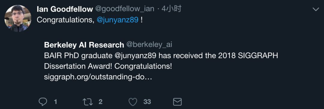 朱俊彦于 2012 年获得清华大学计算机科学系的工学学士学位,在 CMU 和 UC Berkeley 经过 5 年学习后,于 2017 年获得 UC Berkeley 电气工程与计算机科学系的博士学位,他的导师是 Alexei Efros。朱俊彦的博士研究由一项 Facebook 奖学金支持。朱俊彦目前是 MIT 计算机与人工智能实验室(CSAIL)的一名博士后研究员。 朱俊彦个人主页地址:https://ift.tt/2n5j7KQ 博士论文地址:https://ift.tt/2KoYsL4 CycleGAN 项目地址:https://ift.tt/2nRU4N8 在获奖结果公布后,GAN 发明者 Ian Goodfellow 第一时间献上祝贺。