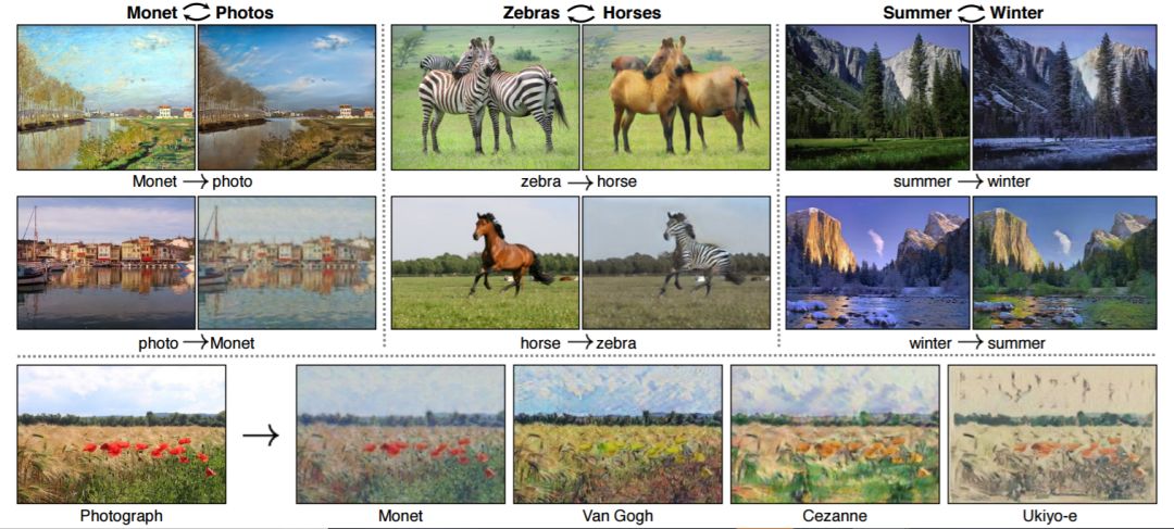 给定两个无序图像集 X 和 Y,CycleGAN 可以自动对它们进行互相「翻译」。 在第三部分中,作者结合他在早期研究中获得的经验,开发了一套新型图像到图像的转换算法。其中非常重要的是 CycleGAN 框架(ICCV 2017),它变革了基于图像的计算机图形学,可作为一种通用框架将一组图像中的视觉风格迁移到其它图像。例如,将夏天转化为冬天、将马转换为斑马及利用计算机图形渲染生成真实图像等。 该研究首次展示了艺术收藏品的风格迁移效果(例如,使用所有梵高的作品,而不是只用《星月夜》),并将绘画转换为照片。自发布以来,CycleGAN 在短短时间内就已经被应用到了很多不同的问题中,其范围远远超越了计算机图形学,从生成合成训练数据(计算机视觉)到将 MRI 影像转换为 CT 扫描影像(医学影像),再到 NLP 和语音合成的应用。除博士论文外,他还提出了基于学习的交互式着色方法(SIGGRAPH 2017)和光场摄像方法(SIGGRAPH 2017)。 除了在顶级图像与视觉会议上发表的文章以外,朱俊彦的成果在其他方面也颇具影响。他的研究多次出现在大众媒体上,包括《纽约客》、《经济学人》、《福布斯》、《连线》等。朱俊彦在推进研究复现方面堪称典范,这令研究人员和从业者更容易「站在他的肩膀上」。他的许多项目都是开源的,影响力也很大,他在 GitHub 上的项目已经获得 22000 次收藏和 1900 个关注者。最令人印象深刻的是,他的代码不仅被研究人员和开发人员广泛使用,而且还被视觉艺术家使用(例如 Twitter 上的 #cycleGAN)。