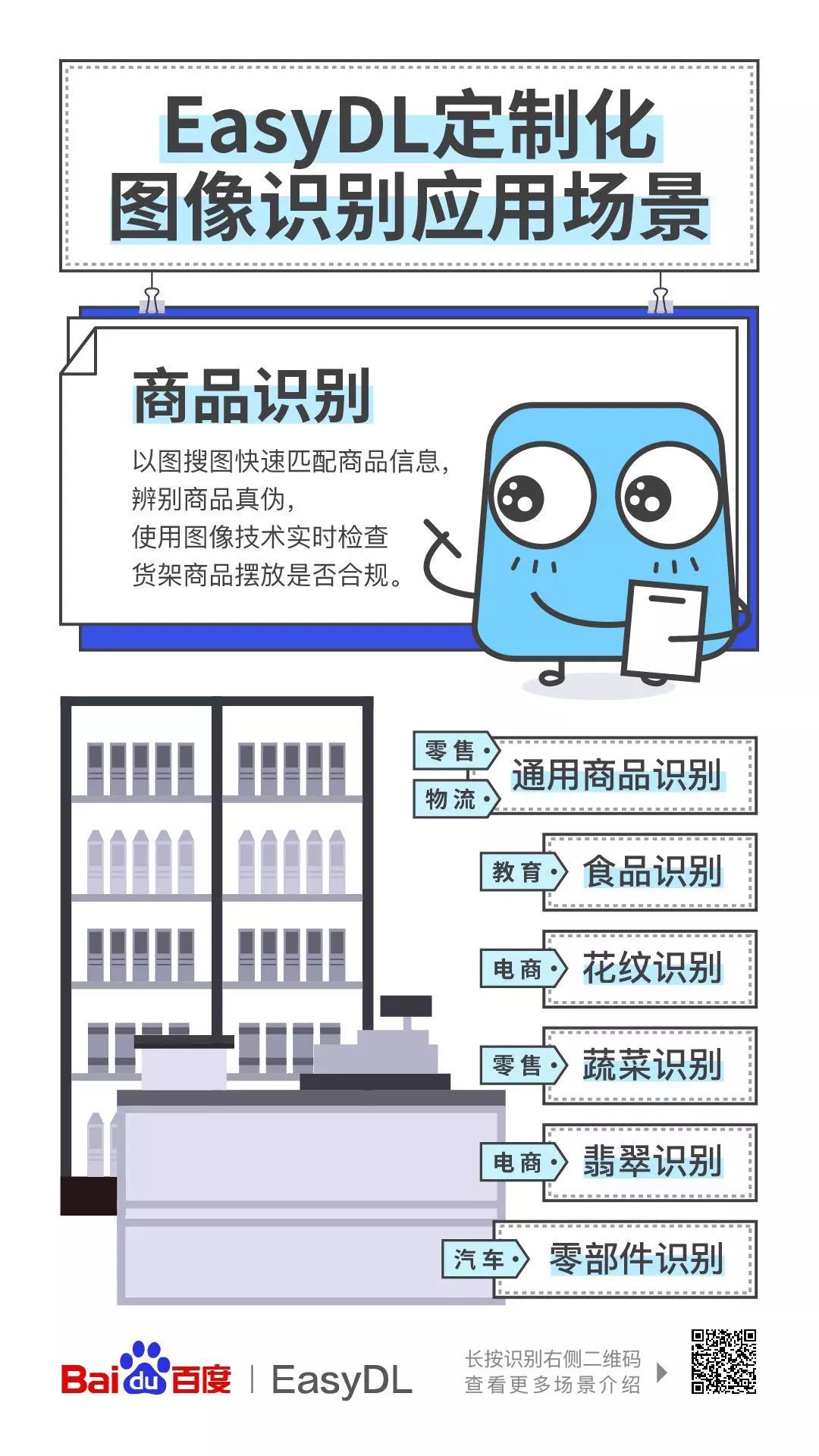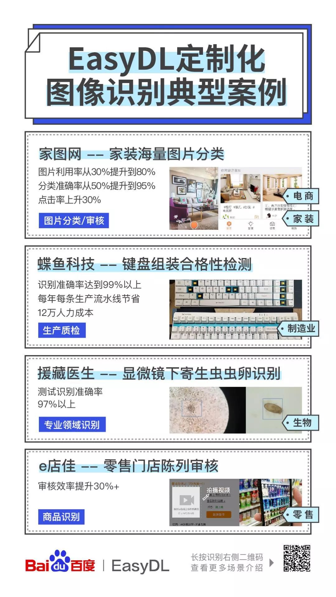 在缺医少药的藏区,调配或者培训能够准确识别寄生虫虫卵的医生,都并非易事。援藏医生陈静飞运用百度的定制化训练与服务平台 EasyDL 进行显微镜下寄生虫虫卵识别,辅助检验人员进行相关诊断,有效改善人工识别的诸多不足。 目前模型已经在临床进行小范围试点,辅助检验人员进行相关诊断,经临床试点测试准确率达97%。 四、 商品识别 除了一线工厂、西藏牧区,其实 EasyDL 早就已经进入了我们的日常生活之中,比如在超市、卖场、小卖铺里,能够帮助人们识别商品、辅助进行无人结算等。 与前面描述的情况类似,如果完全依靠人工进行识别和分拣,会有很多的重复劳动。不吃不喝不觉累的机器,是一个很好的"替补选手"。