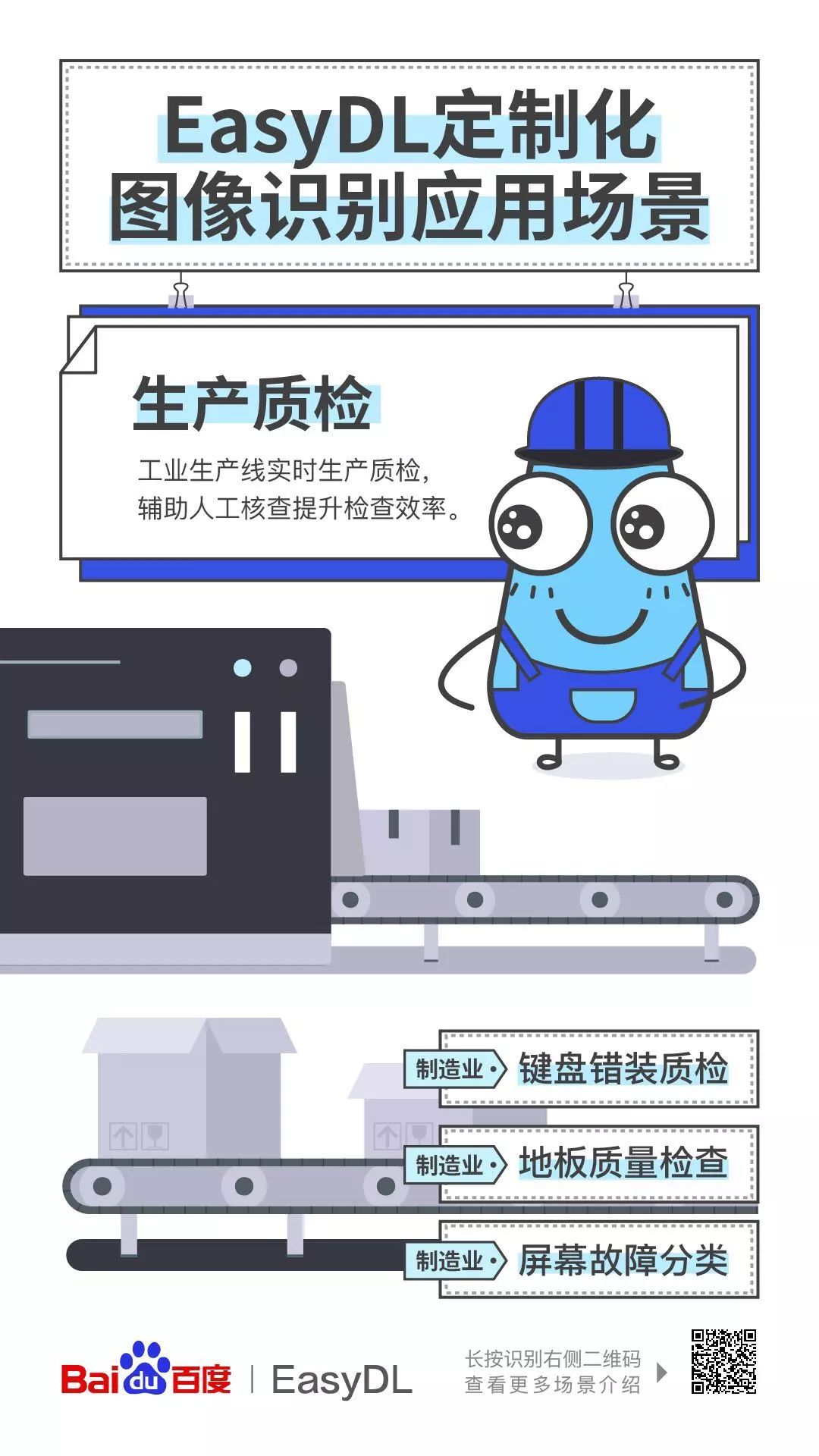 二、生产质检 随着工业化的快速实现,生产领域的许多体力劳动都在逐渐被机械化的流水线解放,而最后一环的"质检"工作却依然需要耗费相当大的人力物力。如何帮助工人们又好又快地完成质检工作,恰好是 EasyDL 定制化图像识别的"用武之地"。