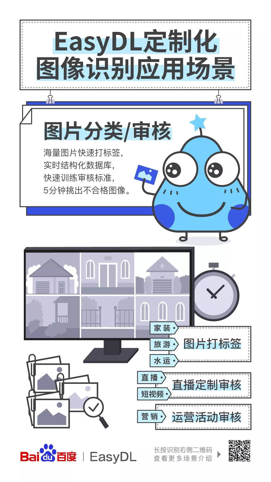其实,应用广泛的 EasyDL 具体都有哪些用处,也是有迹可循的。今天我们就来做个简单分类、举几个例子,跟大家说说, EasyDL 定制化图像识别,应用在哪儿?怎么用? 一、 图片分类、审核 有首陕北民歌这样唱,"他大舅他二舅都是他舅,高桌子低板凳都是木头",对于人类来说,对不同物品进行分辨和归类简直是轻而易举,但当几百万张图片摆在面前的时候,机器的优势就体现出来了。 之前多次被 cue 到的"家图网",就是应用了 EasyDL 定制化图像识别的这一功能,为百万张家居图片分门别类地打好了标签,更精准地推荐给用户。 通过实时结构化数据库和快速训练审核标准, EasyDL 定制化图像识别的图片分类/审核功能还可以应用在如今大热的短视频领域,随时定制审核标准,快速将视频中的违规画面筛查出来。
