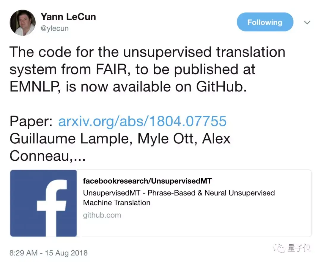 昨天,Yann LeCun大神发推宣布,Facebook的两个无监督翻译模型,开源了。