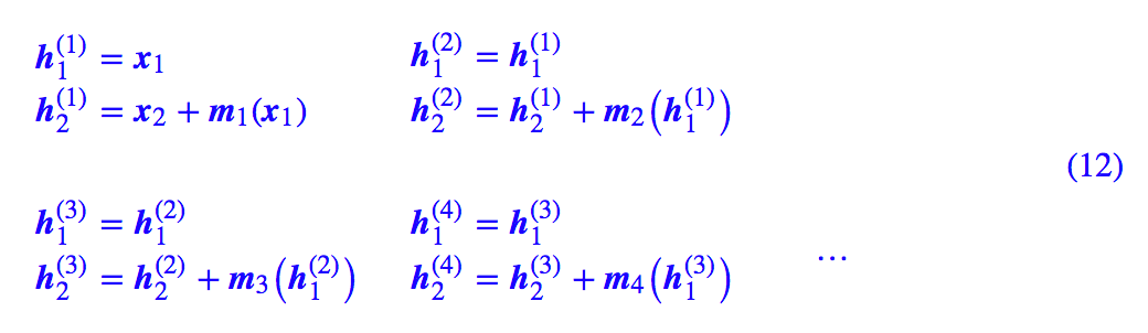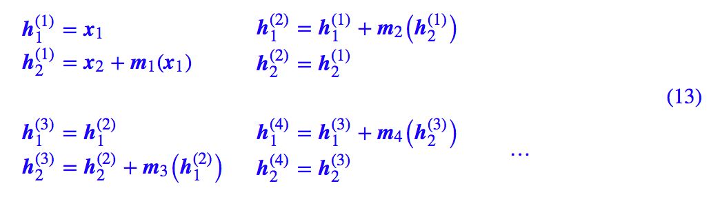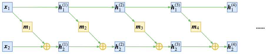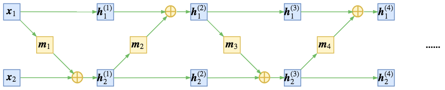 ▲ 简单的耦合使得其中一部分仍然保持恒等,信息没有充分混合 为了得到不平凡的变换,我们可以考虑在每次进行加性耦合前,打乱或反转输入的各个维度的顺序,或者简单地直接交换这两部分的位置,使得信息可以充分混合,比如: