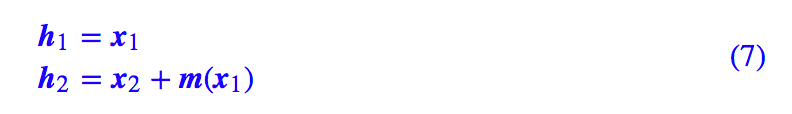 这个优化目标是可以求解的。并且由于 f 容易求逆,因此一旦训练完成,我们就可以随机采样一个 z,然后通过 f 的逆来生成一个样本 ,这就得到了生成模型。 flow 前面我们已经介绍了 flow 模型的特点和难点,下面我们来详细展示 flow 模型是如何针对难点来解决问题的。因为本文主要是介绍第一篇文章 NICE: Non-linear Independent Components Estimation 的工作,因此本文的模型也专称为 NICE。 分块耦合层 相对而言,行列式的计算要比函数求逆要困难,所以我们从"要求 2"出发思考。熟悉线性代数的朋友会知道,三角阵的行列式最容易计算:三角阵的行列式等于对角线元素之积。所以我们应该要想办法使得变换f的雅可比矩阵为三角阵。NICE 的做法很精巧,它将 D 维的 x 分为两部分 x1,x2,然后取下述变换: