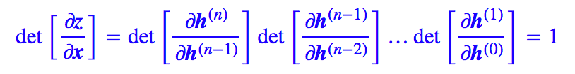 其中每个变换都是加性耦合层。这就好比流水一般,积少成多,细水长流,所以这样的一个流程成为一个"流(flow)"。也就是说,一个 flow 是多个加性耦合层的耦合。 由链式法则: