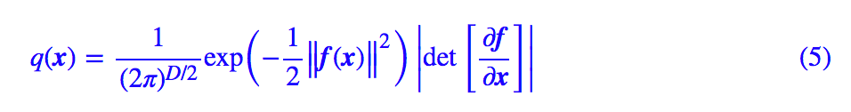 的标准高斯分布(D 是 z 的维度),现在要做一个变换 z=f(x)。注意概率密度函数的变量代换并不是简单地将 z 替换为 f(x) 就行了,还多出了一个"雅可比行列式"的绝对值,也就是: