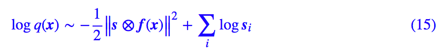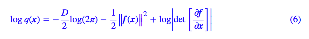 将流模型 z=f(x) 代入上式,然后取对数,类似 (6) 式,我们得到: