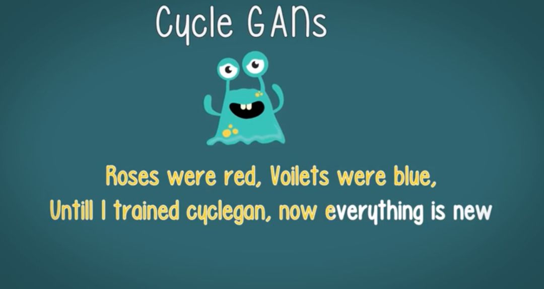 玫瑰是红的 紫罗兰蓝紫色 等我用cycleGAN训练完 所有事情都变样了 接下来 我们看下Cycle GANs。 Cycle GANs所采用了一种非常神奇的学习方法。