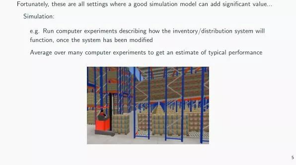 机器学习和人工智能并不是仅有的途径,对于特定情境下的问题,机器学习并不适用,尤其是回答一些"what if"的问题时。当过去已发生过类似的例子并收集到大量的数据时,机器学习可以被应用,但很多时候我们没有足够的数据,或者无法获取这些历史数据,这时候机器学习就没有那么有效。 比如,第一个例子,一个零售商想要新建一个自动化的配送中心,来取代现在的人力配送。这是一项花费巨大的工程,所以管理层会想要关心这个中心能帮助提高多少配送时间和顾客满意度。这不是一个机器学习或者人工智能可以大放异彩的问题,因为我们正在面临一个崭新的决策,并没有相关的历史数据能告诉我们这个新技术给公司层面带来的利益如何。 第二个例子,近年来线上销售大红大紫,在零售商利润中占据了的很大比例,传统零售业更多地参与到线上销售的过程中,他们需要更多地了解线上销售来定位自己在线上销售中的位置。有一个自然的问题是,线上订单会给线下商店带来什么影响。显然会有更多的到店订单,但与此同时货架上的商品也会减少。这其中也有许多"what if"问题会显著影响到公司的成功与否。 第三个例子是供应链管理中的大危机,例如日本地震时主要的供应链被中断了几个月,很多工厂、零售商必须连夜之间重新配置供应链。这些危机也许在未来会更普遍,因为我们的供应链趋向于全球化,因而也更有可能被潜在的危机影响。但是,对于这些问题严重缺乏历史数据,所以机器学习和人工智能难以适用。 但这些都是仿真可以代替机器学习起到作用的情景。仿真通过利用计算机和计算机实验来进行决策,主要的想法是建立供应链或者库存管理模型,迅速进行大量计算机实验来寻找主要会发生的典型情景,寻找出系统发生大变化时产生的主要影响。仿真的作用就是在问题真实发生和决策被实施之前了解到它们并及早采取措施。