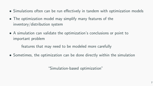 仿真不仅仅能够补充机器学习完成其不能,同时适用于优化领域。因为优化方法在处理现实问题时,倾向于抽象并简化很多现实世界中的特点与条件,而运行仿真系统,可以包括更多的细节来验证优化问题的结论或观点对于真实世界是否适用。