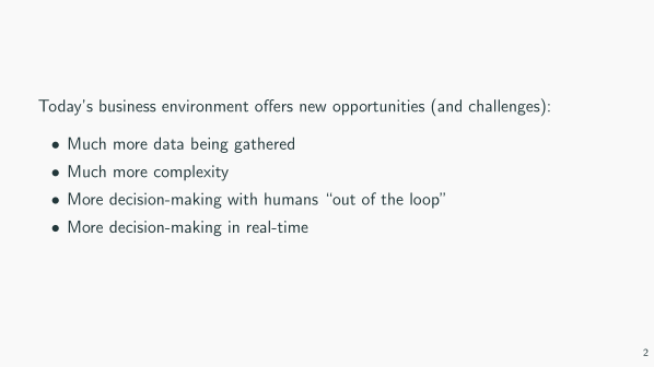 美国工程院院士、斯坦福大学教授Peter W. Glynn Peter W. Glynn: 今天我主要是基于相关的研究问题,给大家分享一个观点——基于数据的决策。为解决各类问题,给大家展示一个由机器学习、人工智能和其他工具共同搭建的平台。 我们讨论利用仿真来进行决策,尤其是在库存管理的背景下。机器学习和人工智能正对世界产生着巨大影响,近几年的影响可能比过去几十年的总和还要突出,但这并不意味它们能解决所有的决策问题。而仿真也正在解决令人兴奋的决策问题,在决策中同样举足轻重。 当今的商业环境给予我们许多机遇和挑战。一是,更多的数据被收集,如各类数据在店铺层面、顾客层面和供应链层面被收集;二是,数据更加复杂,更多公司参与了零售环节,线上销售占据了更大比例,让人深思未来产业链的分配模式和新兴科技例如自动驾驶带来的影响。三是,很多决策过程甚至不需要人类的参与而是自动进行的。四是,对实时决策的需求突出。