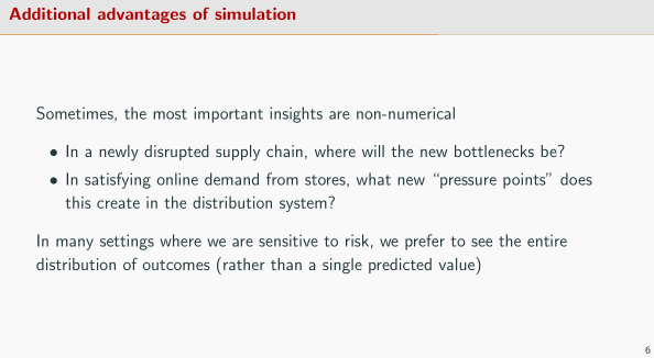 在现实世界中,大多重要的管理启发并不是量化的,但在机器学习中我们得到的经验和启示都是量化的。对于一个大规模的系统,机器学习的量化信息可能无法帮助我们理解系统的本身的工作原理,但是仿真也许能让我们追溯到模型的源头,了解一个供应链优于另一个的原因。 想要把一个系统的机理完全用量化的方式来衡量并不是一件容易的事。另外,在制定重大决策或者进行大笔金额投资时,我们倾向于看到各种可能结果的分布,而不是仅仅一个可能的结果。因为这一结果与随机发生的事件有关,是一个有特定原因的结果,而我们如何理解这一结果对于如何决策至关重要。