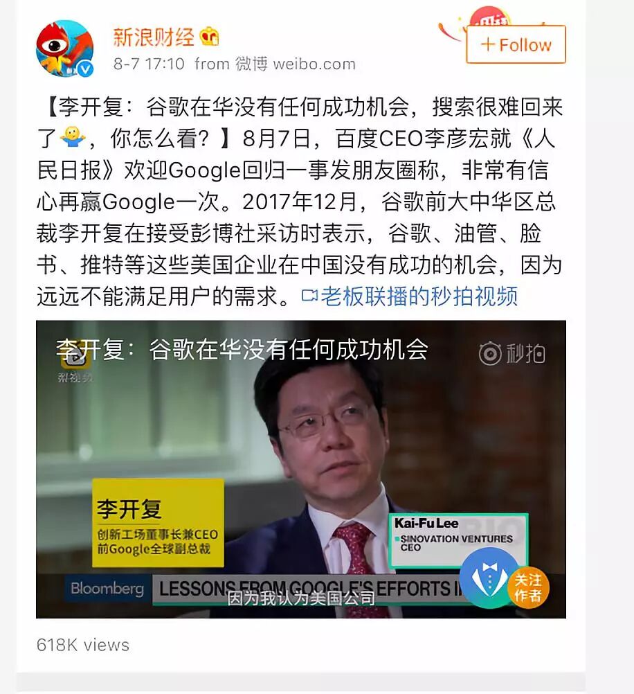「Google、Youtube、Facebook 等公司在中国都没有成功的机会,因为远远不能满足用户要求。」