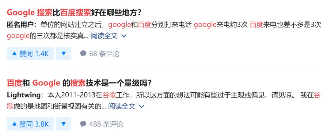 这番言论非常温和,乍看更像是百度的 PR。当然,在 Google 搜索产品没进入中国之前,任何对技术和产品的比较都是成立的。而作为核心收入来源,搜索市场对百度来说一定会「寸土必争」。 虽然我们没有能力对百度与谷歌的产品与技术实力进行有效评价,也并不认为百度没有能力「战胜」Google。但我们认为,「合作」一词不能充分衡量一家科技公司的人工智能技术水平;而科技公司的服务能力与产品水平,只能由用户来证明。 或许知乎上两个回复量与点赞量都很高的话题(下图)可以对这场 Google「回归之谜」与两家公司的产品技术实力有一个更加多样化认识,其中不乏一些专业性的技术分析与理性思考。