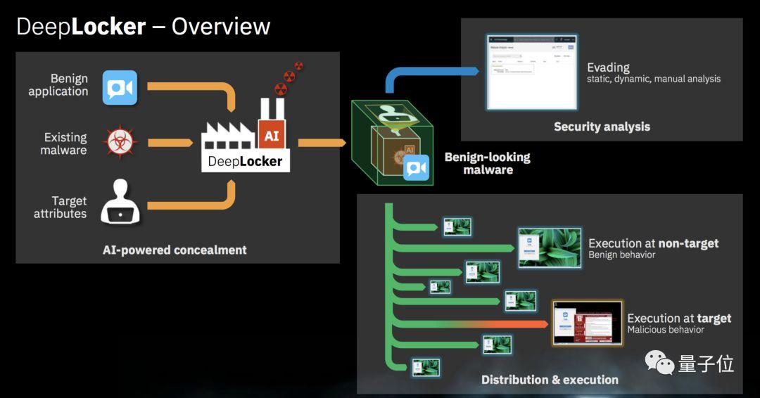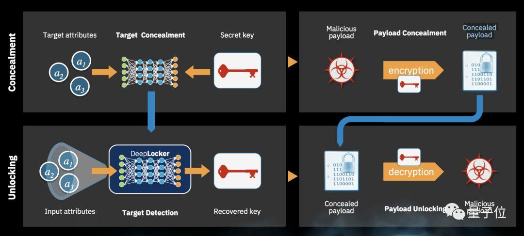 DeepLocker的优越性在于,一方面不会显示程序正在寻找的内容,比如人脸、组织或环境特征,隐藏它在寻找的人;另一方面,DeepLocker会完全伪装成人畜无害的样子,隐瞒程序的恶意用途,收起自身的锋芒。
