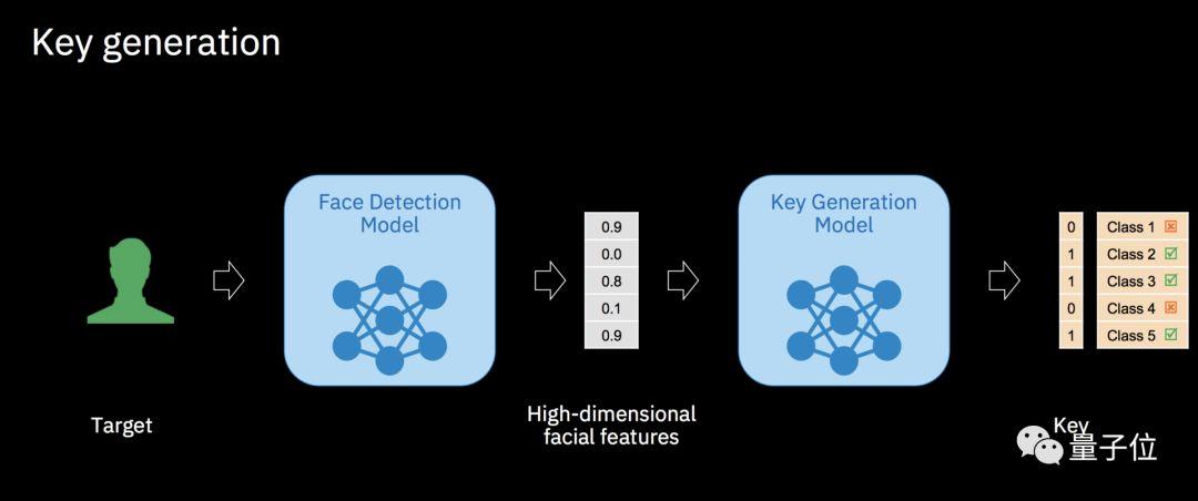 以人脸为例,当系统检测到人脸时,根据面部特征生成高位人脸特征,之后通过钥匙生成模型,将特征转化为一串密码。如果密码正确,也就是说人脸符合目标属性,病毒就会被放出来。