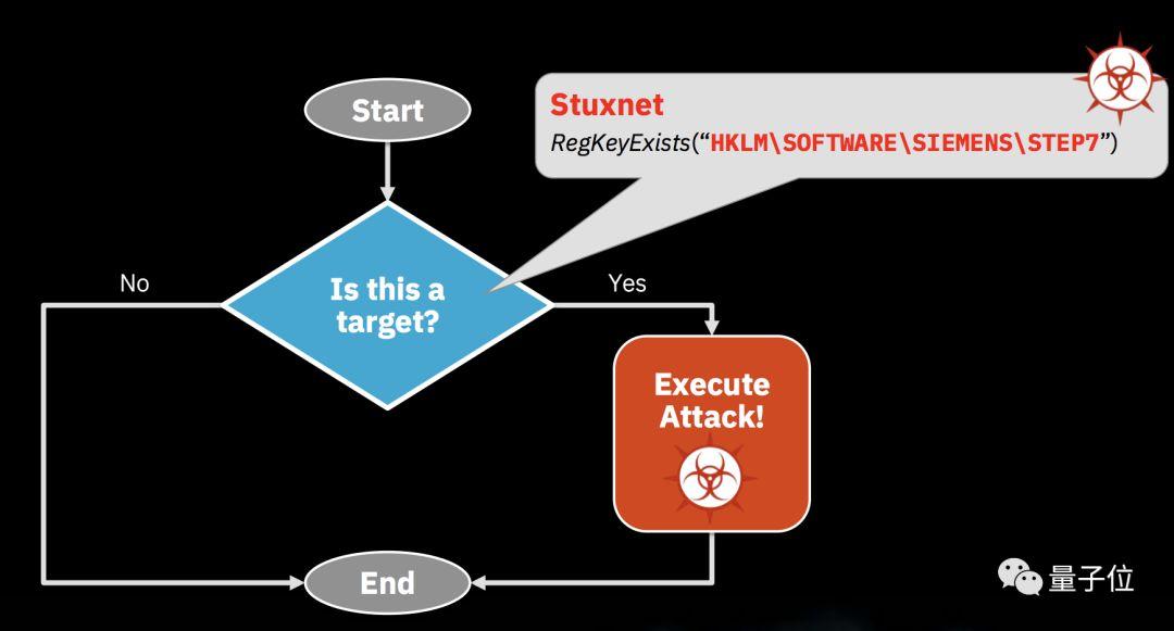 前文提到的攻击铀浓缩设施的震网是用的传统的"if…else"结构,如果发现系统中安装了西门子的STEP7,就启动攻击。