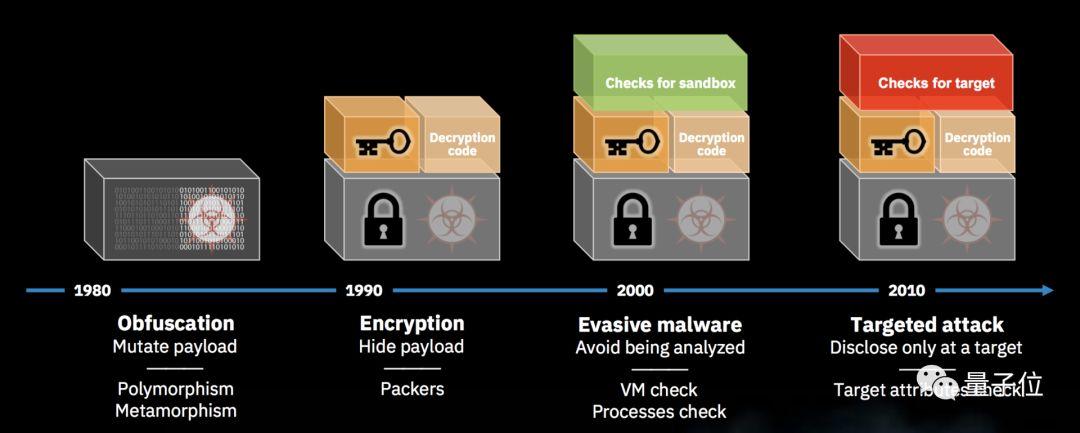 90年代,恶意软件作者们开始给恶意负载加密来蒙混过关,让恶意代码只有在被解密到内存中、即将执行的时候才能检测到;反病毒行业祭出了虚拟运行软件、让病毒暴露本质的沙盒。
