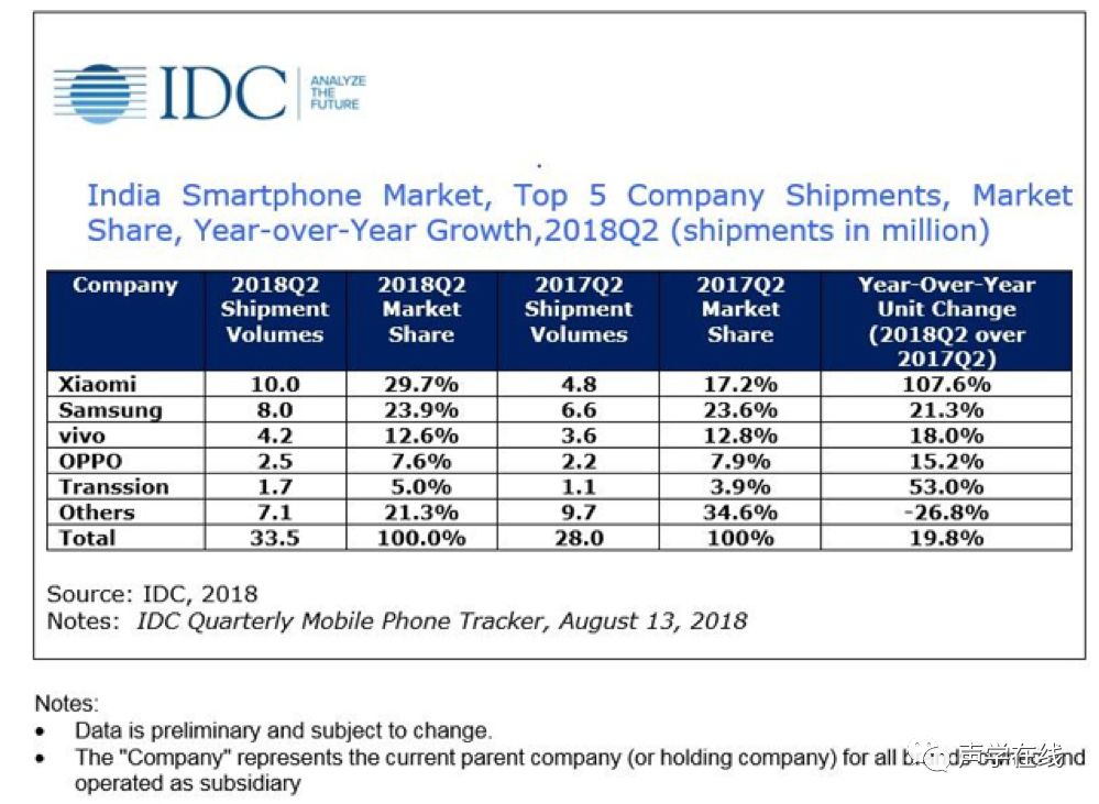 根据Canalys数据,2018年第二季度小米手机在印度市场同比增长106%,连续四个季度稳居市场份额第一。同一时期,在另一个市场容量极大的海外市场印尼,小米出货量位居该国第二。 此外,继2017年11月进入西班牙市场之后,小米在2018年5月扩展至法国及意大利,截至2018年第二季度,小米手机在全球25个国家和地区跻身市场前五,在西欧的出货量同比增长甚至超过2700%。