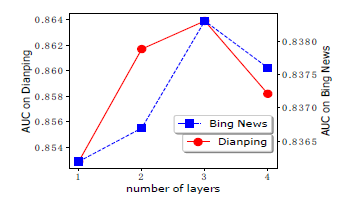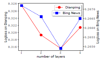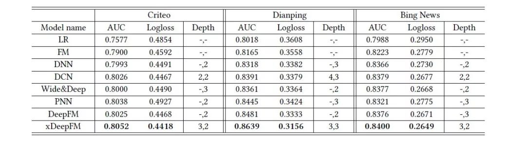 图4 极深因子分解机xDeepFM 集成的CIN和DNN两个模块能够帮助模型同时以显式和隐式的方式学习高阶的特征交互,而集成的线性模块和深度神经模块也让模型兼具记忆与泛化的学习能力。值得一提的是,为了提高模型的通用性,xDeepFM中不同的模块共享相同的输入数据。而在具体的应用场景下,不同的模块也可以接入各自不同的输入数据,例如,线性模块中依旧可以接入很多根据先验知识提取的交叉特征来提高记忆能力,而在CIN或者DNN中,为了减少模型的计算复杂度,可以只导入一部分稀疏的特征子集。 我们在Criteo、大众点评和必应新闻等三个数据集上对上述模型进行评测,这三个数据集分别对应广告推荐、餐馆推荐和新闻推荐等不同的应用场景。所采用的评测指标为AUC和LogLoss。我们将xDeepFM与多种当前主流的深度推荐模型进行对比,结果如表1所示。在三个数据集上,xDeepFM模型在AUC和LogLoss上均超过了其它基准模型。这说明,结合显式和隐式的特征交互能够有效提高推荐系统的准确性。