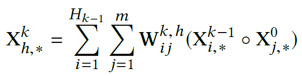 其中,第k层隐层含有H_k条神经元向量。隐层的计算可以分成两个步骤:(1)根据前一层隐层的状态X^k和原特征矩阵X^0,计算出一个中间结果Z^k+1,它是一个三维的张量,如下图所示: