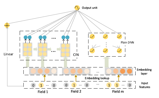 图3 CIN的宏观结构概览 参考Wide&Deep和DeepFM等模型的设计,我们发现同时包含多种不同结构的成分可以提升模型的表达能力。因此我们将CIN与线性回归单元、全连接神经网络单元组合在一起,得到最终的模型并命名为极深因子分解机xDeepFM,其结构如图4所示。