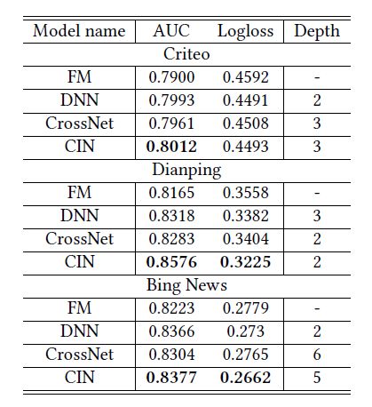 表1 三个数据集上的评测结果 同时,我们还关注不同的基本单元模型的学习能力。我们对比了FM、DNN、CrossNet和CIN在三个数据集上单独学习的结果,它们分别对应只有二阶特征交互、隐式特征交互、特殊的显式特征交互和基于向量的显式特征交互模式。实验结果如表2所示。在Criteo上,CIN和DNN的表现比较接近,而在大众点评和必应新闻数据集上,CIN比其它三个单元模型表现的要好。