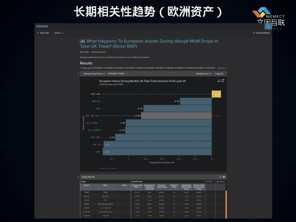 在此之上,刚才提到了,它要做一个趋势性研究,核心就是说如果有一些事情发生了,它跟资产价格之间,在长期来看是什么样相关的趋势。图上这个例子在讲,欧洲的整个资产相对于英国的贸易,它们之间的相关性是什么,这其实是一个很长很长的图,我只截取了前面一段,就是在讲相关性的各种指标是什么。