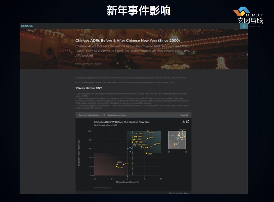 第三个例子是事件影响分析,下图描述了2000年以来,春节对资产的影响,由此可以决定我们的策略。"事件影响分析"也是 Kensho 在新闻里最常见的一个卖点。