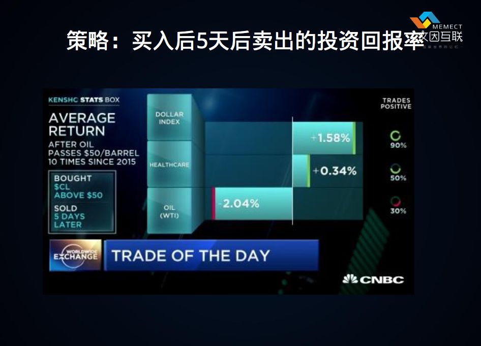 第五个例子是一个策略:如果原油价格超过了50美元一桶之后,我买入,5天之后就卖出,这样的一种事件,从历史预期来看,我能得到什么样的回报率。像这样简单的策略,也是有无穷多种的组合的。