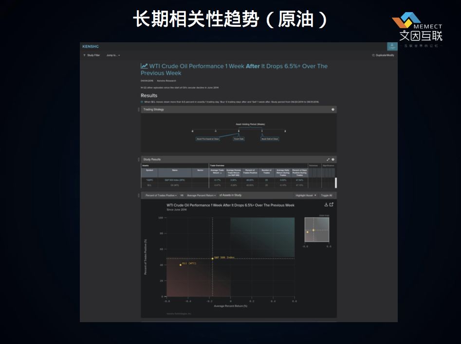 第二个例子是原油(见下图),在某一种价格变动后,WTI原油的表现一周内会发生什么变化?这也是各种指标和指标之间的相关性。所以Kensho里不仅有股票,也有各种大宗资产、期货。
