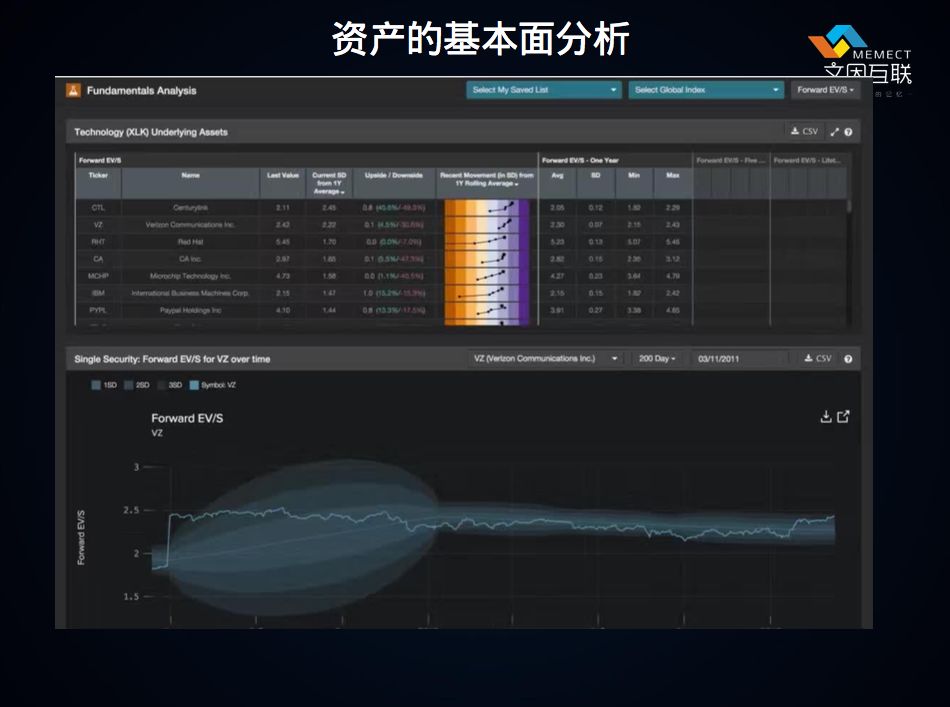 首先, Kensho 的底层是一个很大的数据库。两年前,它是9万个数据集的数据库,在此基础上有各种事件、价格、基本面。 这个图是某一个ETF(Exchange Traded Funds 指数基金)的基本面研究,下面有哪些资产在ETF下面,它们最近的趋势是什么,比例是什么,可以往前的推断指标是什么。这是 Kensho 基本的数据,像这样的数据有成千上万个。