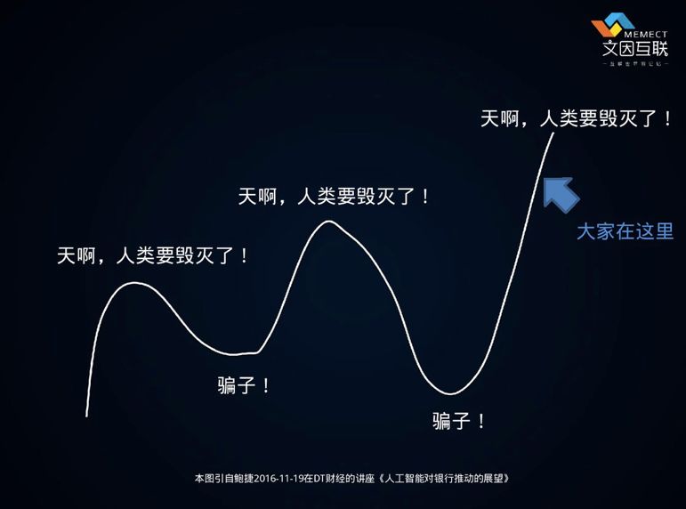 我今天想要和大家探讨: 第一,Kensho是什么; 第二,怎么做出 Kensho; 第三,我们能不能做到; 第四,是否应该那样去做。 接下来要讲的,有的是事实,有的是观点,有的是信仰。 事实是大家都已经看到的东西; 观点我相信而且有一定的证据能够证明的东西; 信仰是在遥远的未来才能够证明的东西。 AI的循环:人神共愤 or 骗子先做一个简单的自我介绍,我从1998年开始做人工智能的研究,人工智能有几个大的学派,神经网络、机器学习,还有逻辑学派,或者说理性主义学派,这几个学派,我或多或少都有一些涉猎。