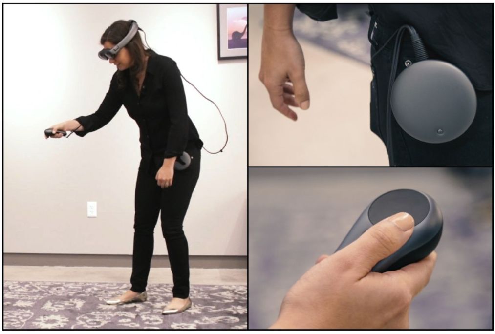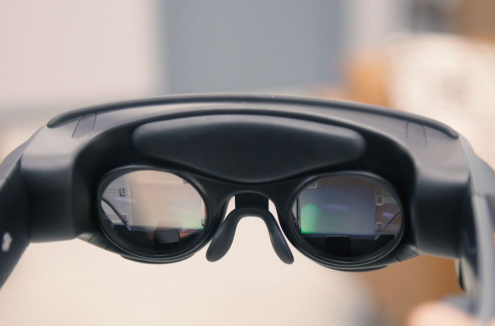 眼镜后面的电缆连接到挂在臀部的微型计算机,它具有计算机的所有部件:处理器,内存,电池,充满电后可为眼镜供电长达三个小时。 虽然穿戴上设备后我看起来有点像一个牵线木偶,还觉得有点热,但是说句实话,这已经是我戴过的最舒适的电子眼镜了。 Lightwear耳机重量为0.7磅,仅为微软HoloLens的一半。此外,耳机内衬的软垫也让我觉得更加舒适。即使在穿戴时间超过45分钟后,我的感觉依然很不错,没有长时间佩戴浮潜面罩或VR眼镜的恶心感。 当耳机的摄像头允许你推动、阻挡和移动一些虚拟对象时,手持控制器可以让你在主菜单中选择不同的应用程序,将对象移动到房间的不同部分并调整对象大小。一些应用程序还支持语音命令。耳机里有两个扬声器,能够为视觉幻象添加3D音频。 Magic Leap眼镜的内侧视角