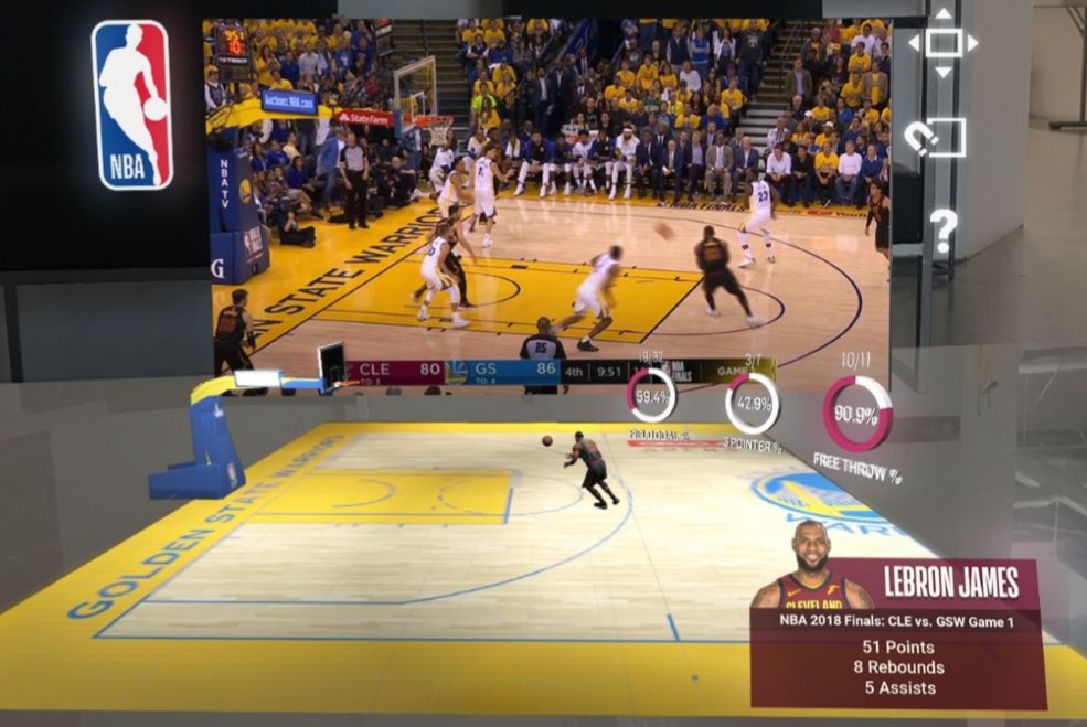 配合这款眼镜投射的网页浏览器简直合教室里的黑板一样巨大。我把它"挂"在墙上,方便我等下回来。我还在房间的中央"添加了"一个新窗口,并且选择了Wayfair,然后点击红色轮椅,把它"拖拽"进了房间。我把它"放"在真实的软凳旁边,绕了一圈看了看。 和智能手机革命一样,AR将来一定会有与其相匹配的app。我觉得Magic Leap的技术展示令人印象深刻,有些不寻常的新奇玩意儿。 想象一下在我家中间看球场里的世界杯转播?在任何一个地方看到我儿子学走路的全息图?别拦着我,我要剁手了! Magic Leap已经做出的,或是和其他团队正在开发的一些app已经开始展现出这些体验是可能实现的。其他的还没开发出来,所以它为创作者提供了一套头戴设备。 NBA预览应用程序重点突出了LeBron James的快攻,让人们可以轻松地想象以全新的方式观看新闻,娱乐或体育赛事。Magic Leap的空间网络浏览器将让开发人员共享可以拖放到您自己的环境中的3D模型。 在应用Tonandi中,有草从地表长出来
