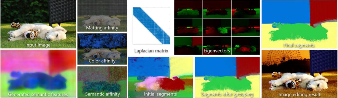 图 2:对于输入图像,我们生成像素级的超维语义特征向量,并利用纹理和语义信息定义一张图。构建该图的目的是使对应的拉普拉斯矩阵及其特征向量能够揭示语义对象和对象之间的软过渡(soft transition)。我们使用特征向量创建初步的软分割集,并结合它们获取具备语义含义的分割。最后,我们细化软分割,使之可用于目标图像编辑任务。图源:[Lin et al. 2014],编辑结果的背景来自 Flickr 用户 rumpleteaser。