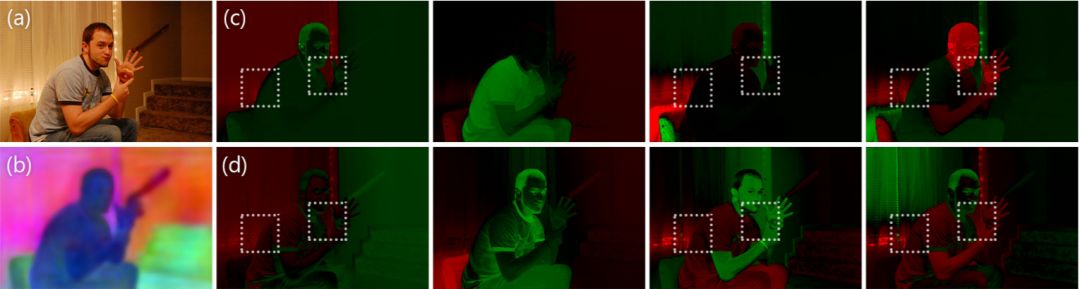 图 5:输入图像(a)、语义特征(b),与对应本文提出的拉普拉斯矩阵(c,顶行)以及(光谱抠图中使用的)抠图拉普拉斯矩阵(d,底行)的最小特征值的几个特征向量。绿色表示特征向量的正值,红色表示负值。我们的拉普拉斯矩阵很清晰地揭示了特征向量中的语义边界,而抠图拉普拉斯矩阵的特征向量延伸到了语义边界之外,如图虚线框中所示。图源:[Lin et al. 2014]。